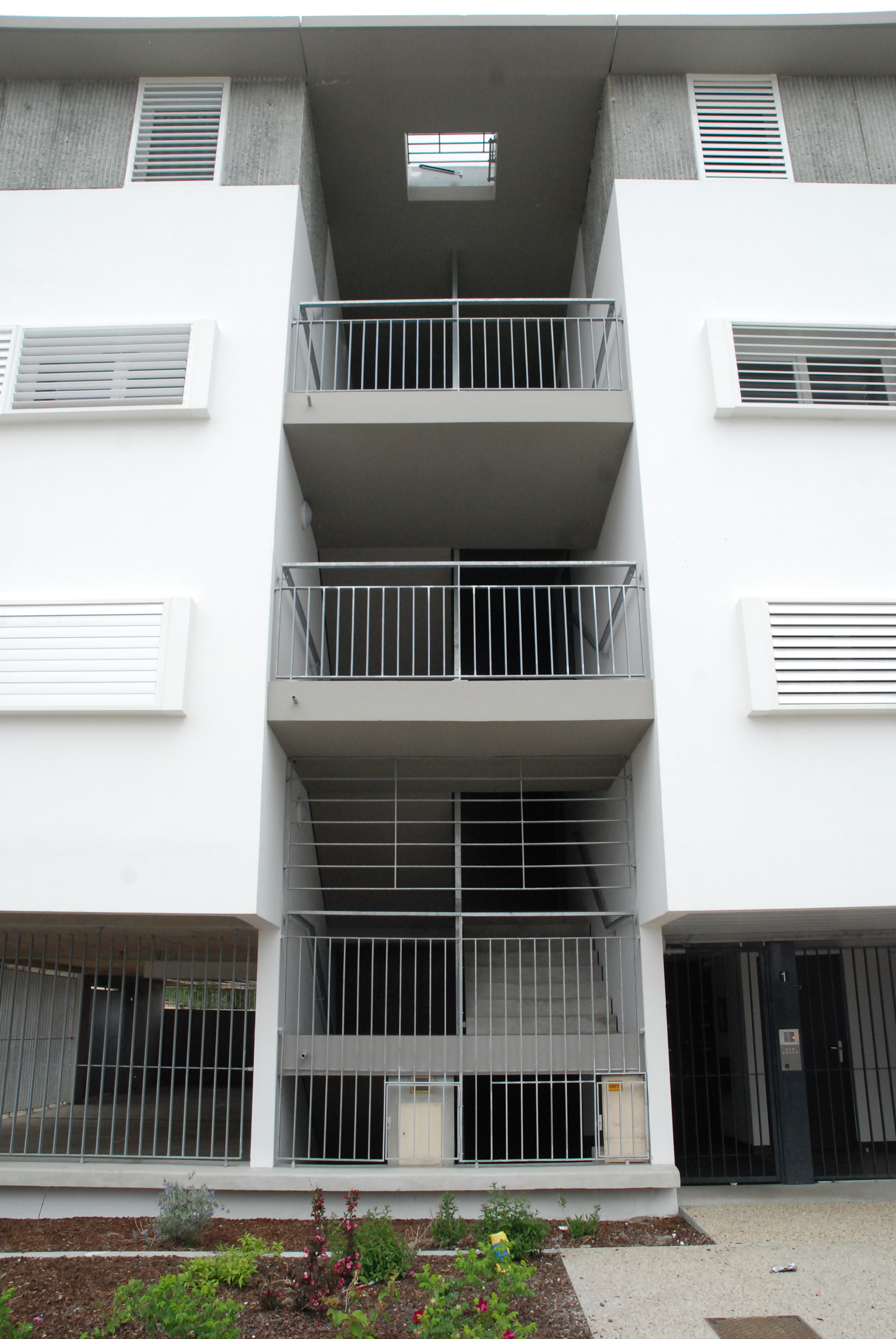 Les habitats intermédiaires, principalement destinés au relogement des habitants du quartier et situés à l’angle d’une rue nouvellement créée, s’articulent autour d’une cour commune plantée, protégée de la rue.