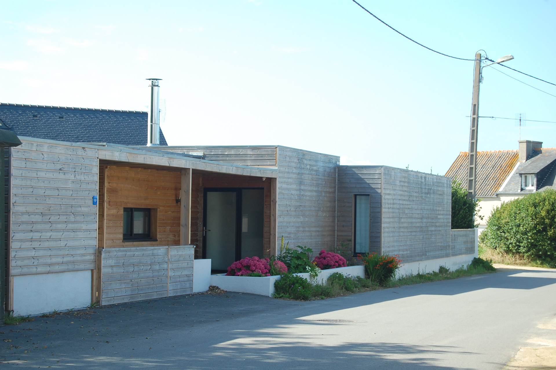 La façade publique est traitée comme une clôture épaisse, habitée. L’agencement d’un car-port, d’un abri de jardin, les retraits crées par les accès, l’implantation d’une large jardinière compensent la rigueur d’une élévation dépourvues de percements.